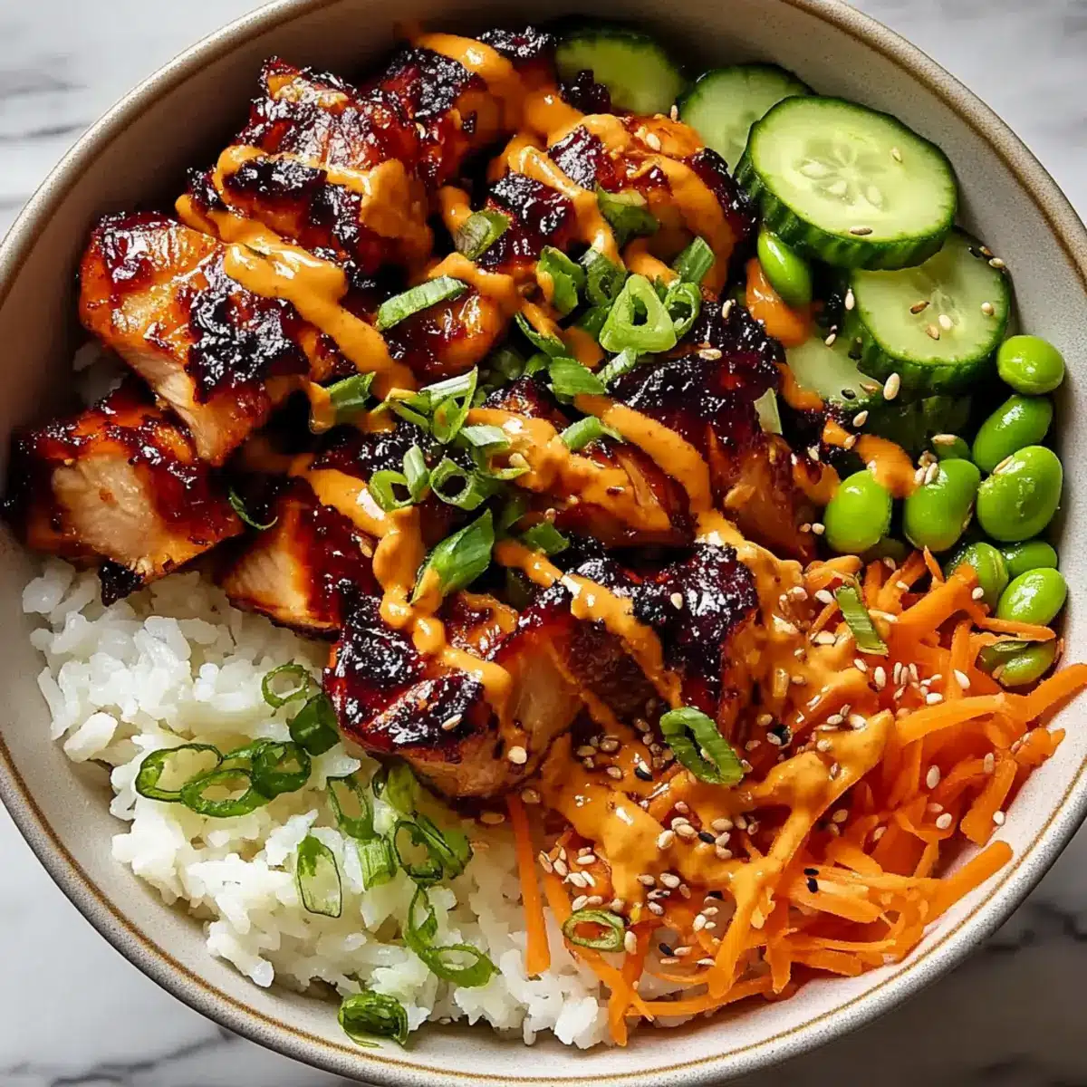 - In each bowl, layer cooked rice, top with caramelized chicken, and arrange toppings around for a colorful presentation.