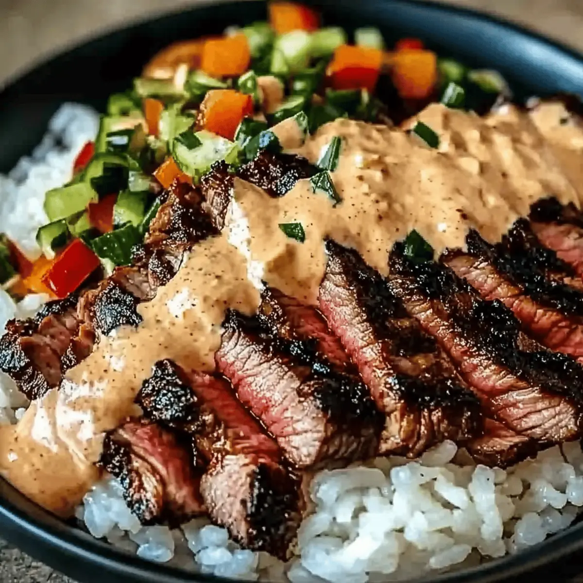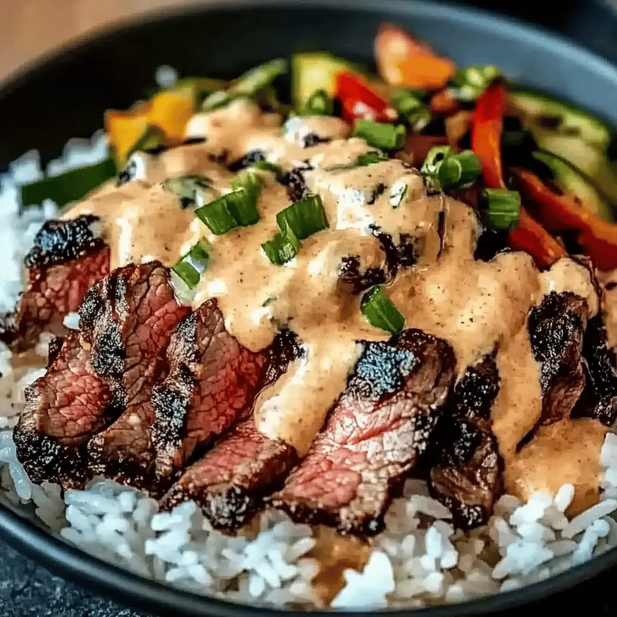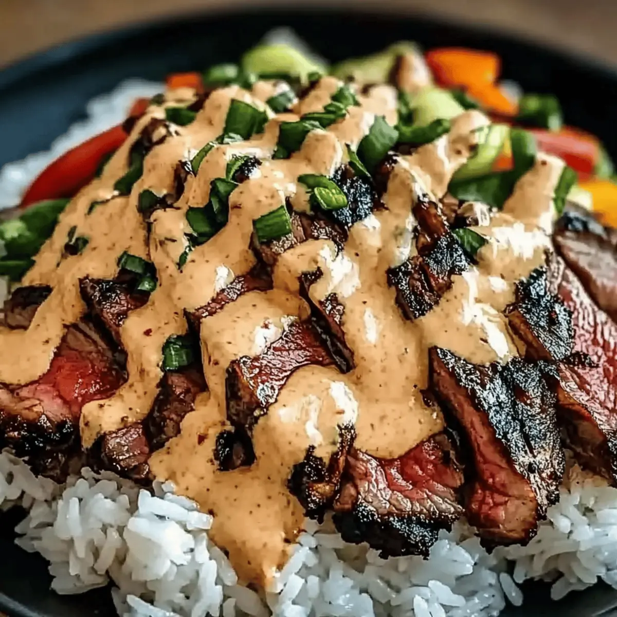7. Assemble Bowls: Place warm jasmine rice in bowls, layer sliced steak and vegetables, and drizzle with spicy cream sauce.