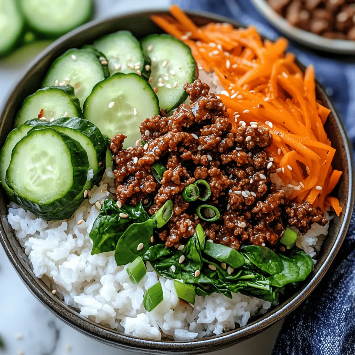 - Layer your beef bowl with fresh ingredients like sliced cucumbers, shredded carrots, and sautéed spinach.