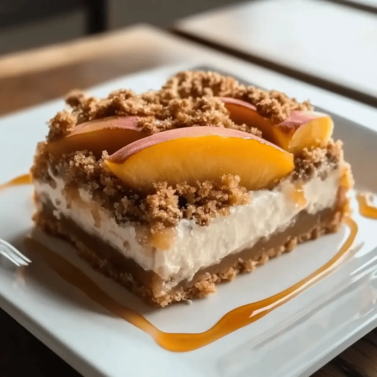 Impressive Presentation: Layers of rich cheesecake, juicy peaches, and crunchy streusel make these bars visually stunning.