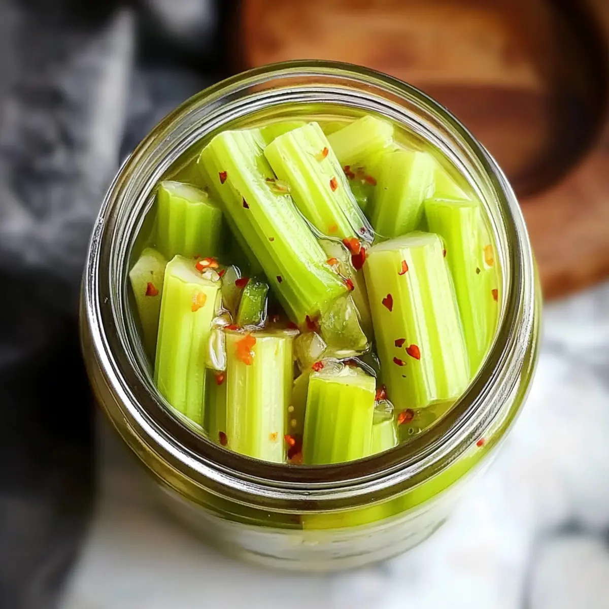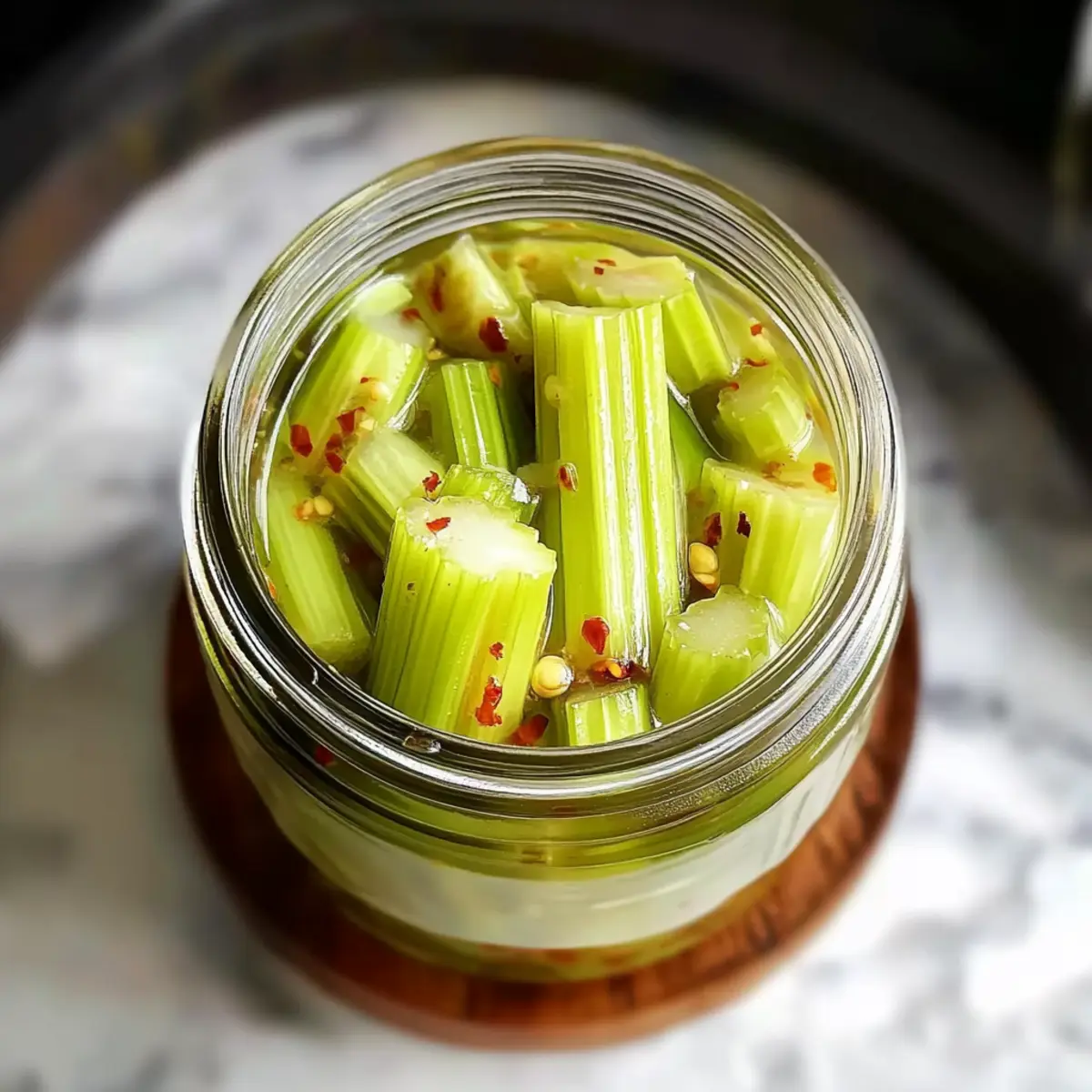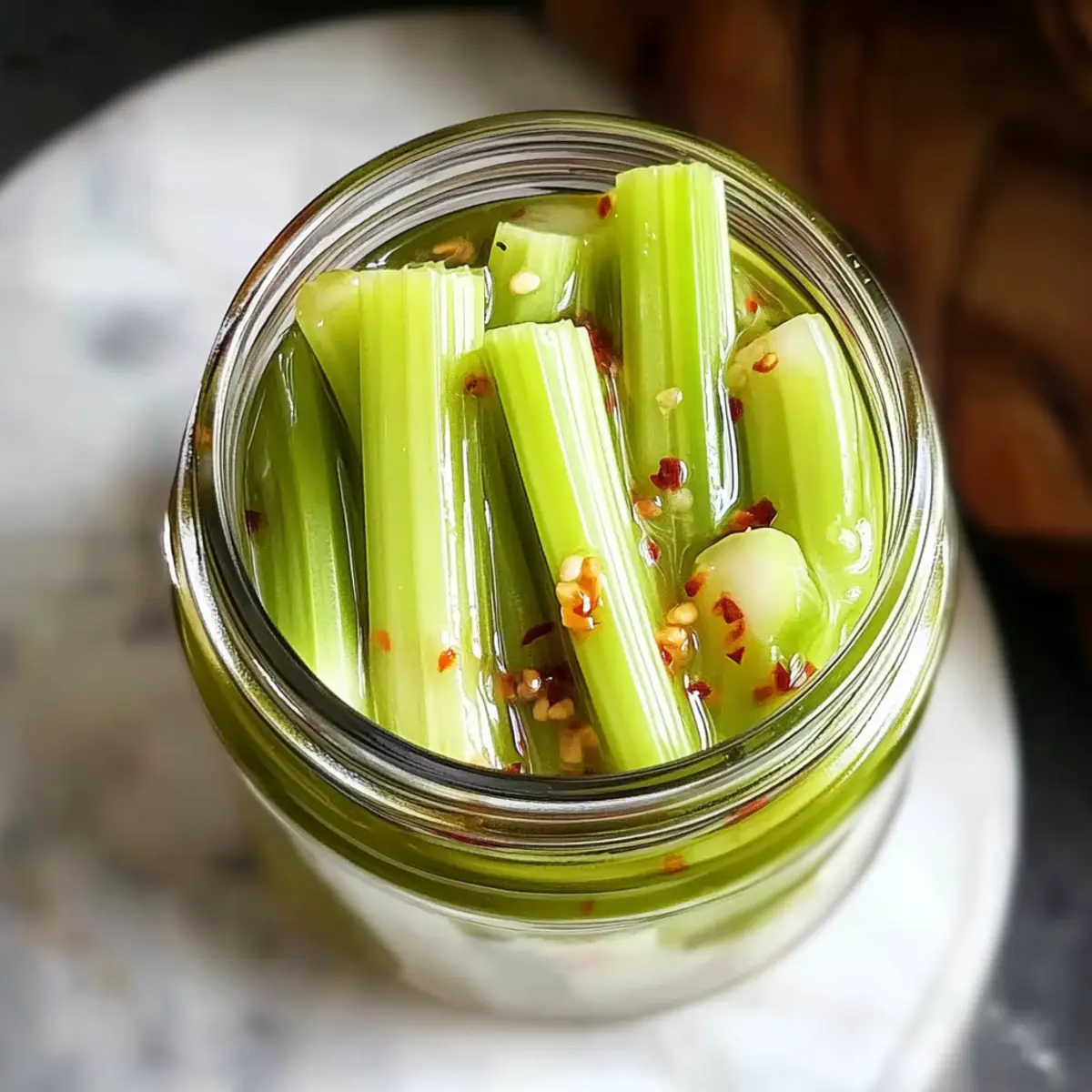 Stir in red pepper flakes to the warm brine, adjusting to your desired level of heat. Allow the brine to sit for a few minutes to let the flavors meld. You’ll notice the vibrant colors and aromatic hints wafting up, signaling it’s ready for the next step in creating your zingy Quick Pickled Celery.
