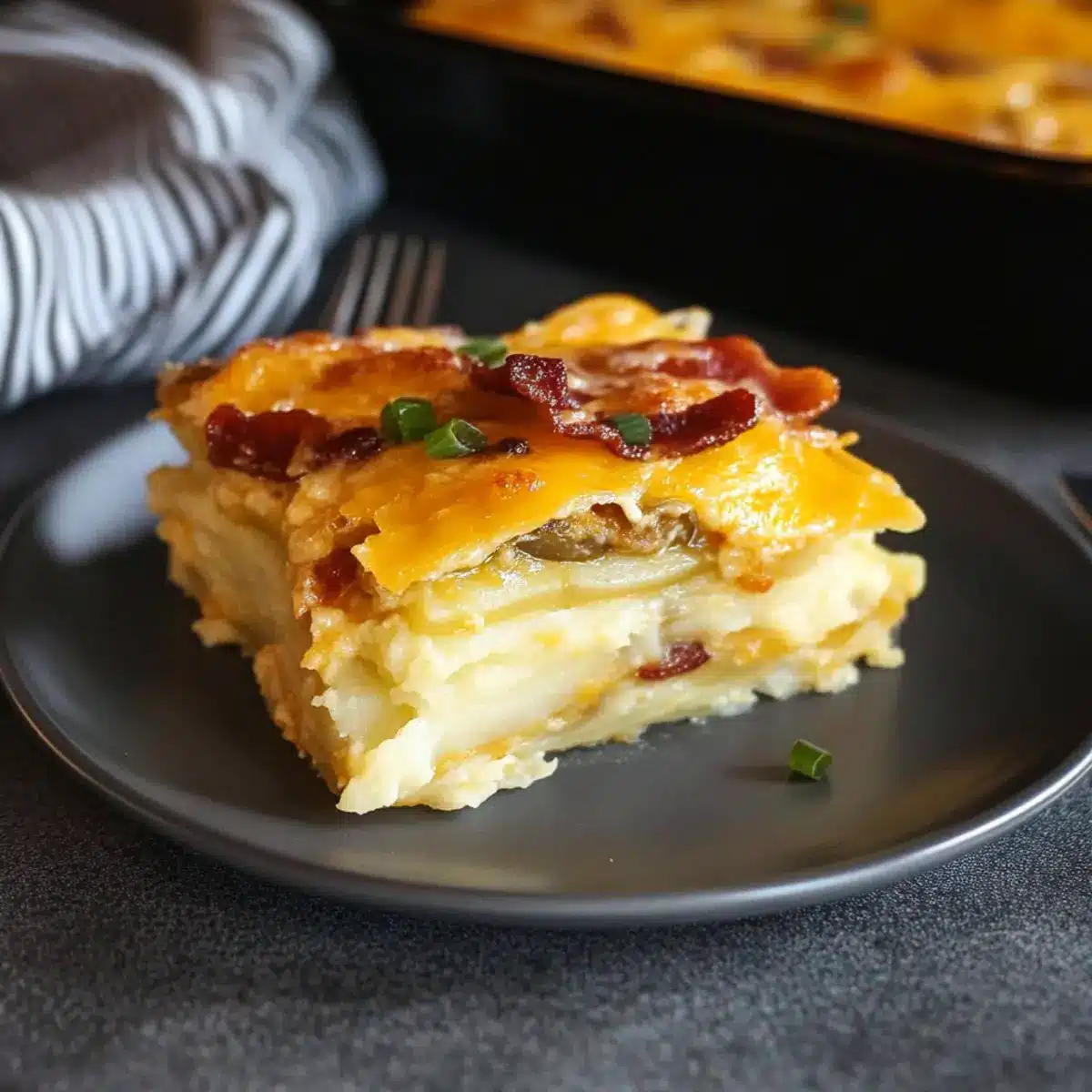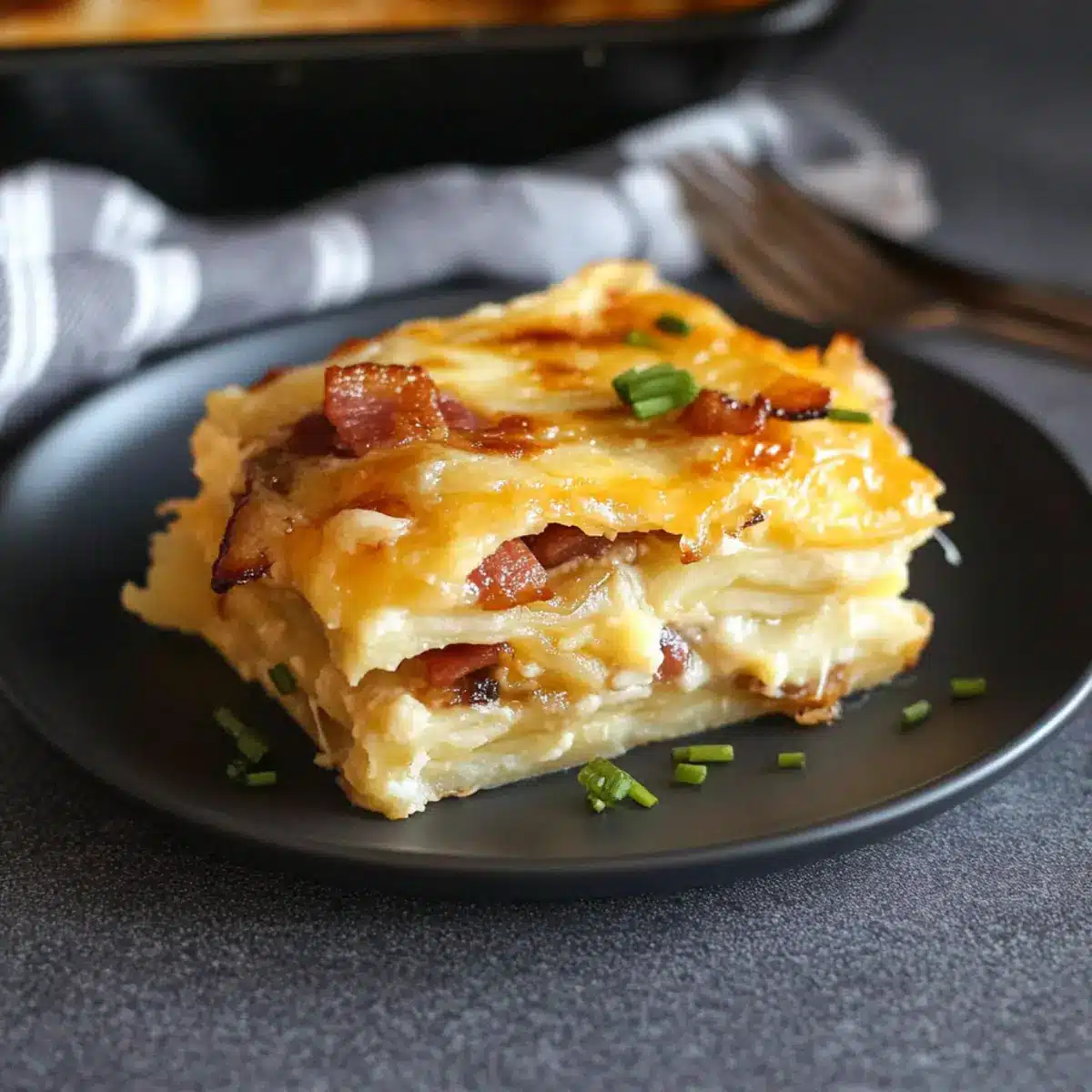 - Once baked, remove the Pierogi Lasagna from the oven and let it cool for about 10 minutes. Just before serving, top with the remaining crispy bacon and freshly sliced scallions.