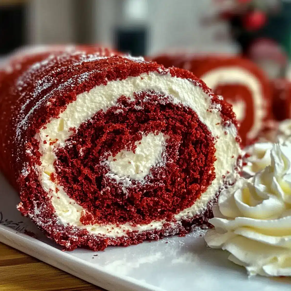 Refrigerate the assembled Red Velvet Cake Roll for about an hour to help set the filling and firm up the cake. Before serving, dust the top with a light sprinkle of powdered sugar to add a touch of sweetness and beautiful presentation, making it ready for your guests to enjoy!