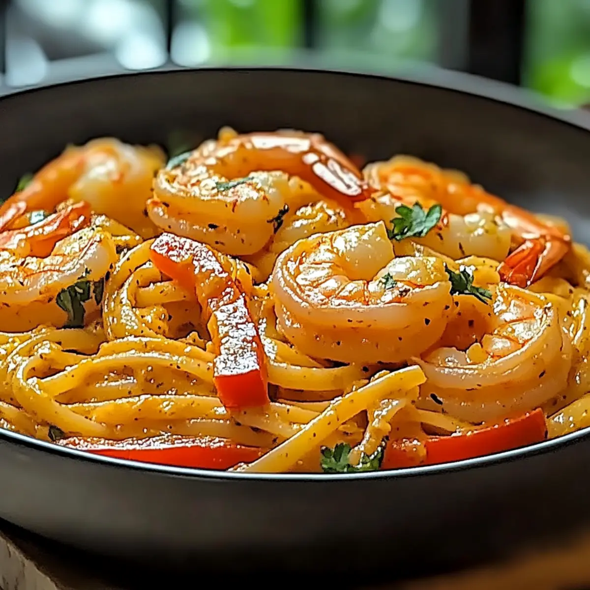 Remove the skillet from heat and serve the Shrimp Pasta Delight immediately. Garnish with freshly chopped cilantro and serve alongside lime wedges for an extra zesty kick. The vibrant colors and aromatic flavors make this dish not just delicious but visually enticing, perfect for impressing family or guests alike.