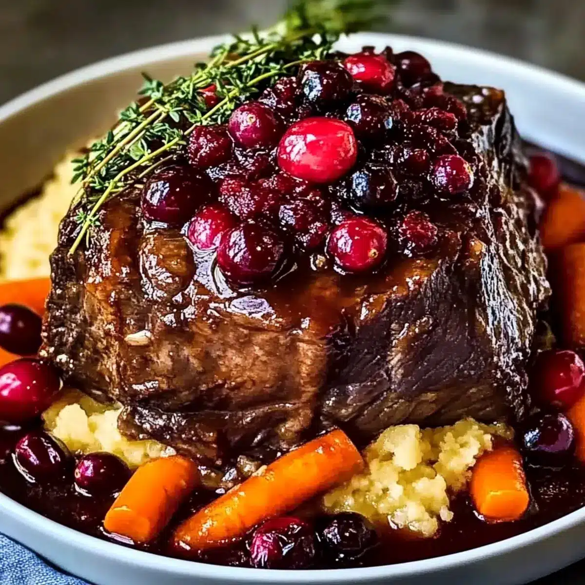 As I stood by the kitchen window, the aroma of the Slow-Braised Beef Roast with Cranberry Balsamic Glaze wafted through the air, instantly transforming my home into a cozy haven. This dish isn’t just another dinner; it’s a comforting celebration that pairs tender, slow-cooked beef with a tangy berry glaze, creating a warm embrace of flavor that beckons you to gather around the table. Not only is it a fantastic centerpiece for holiday feasts, but it also makes for a nourishing weeknight meal that’s surprisingly effortless. The best part? It promises a delightful balance of savory and sweet, ensuring every bite captivates your taste buds. Whether you’re trying it for the first time or adding a new twist, I can’t wait to share how to bring this heartwarming dish to your table—are you ready to dive into the rich simplicity of home-cooked goodness?
