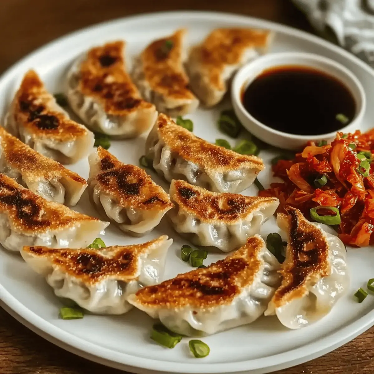 Transfer the crispy gyoza onto a serving platter alongside a bowl of fluffy jasmine rice and some fresh kimchi. Garnish with a drizzle of Lao Gan Ma (or your preferred chili oil) for dipping. Encourage everyone to assemble their bites with gyoza, rice, and kimchi for a delightful meal experience!