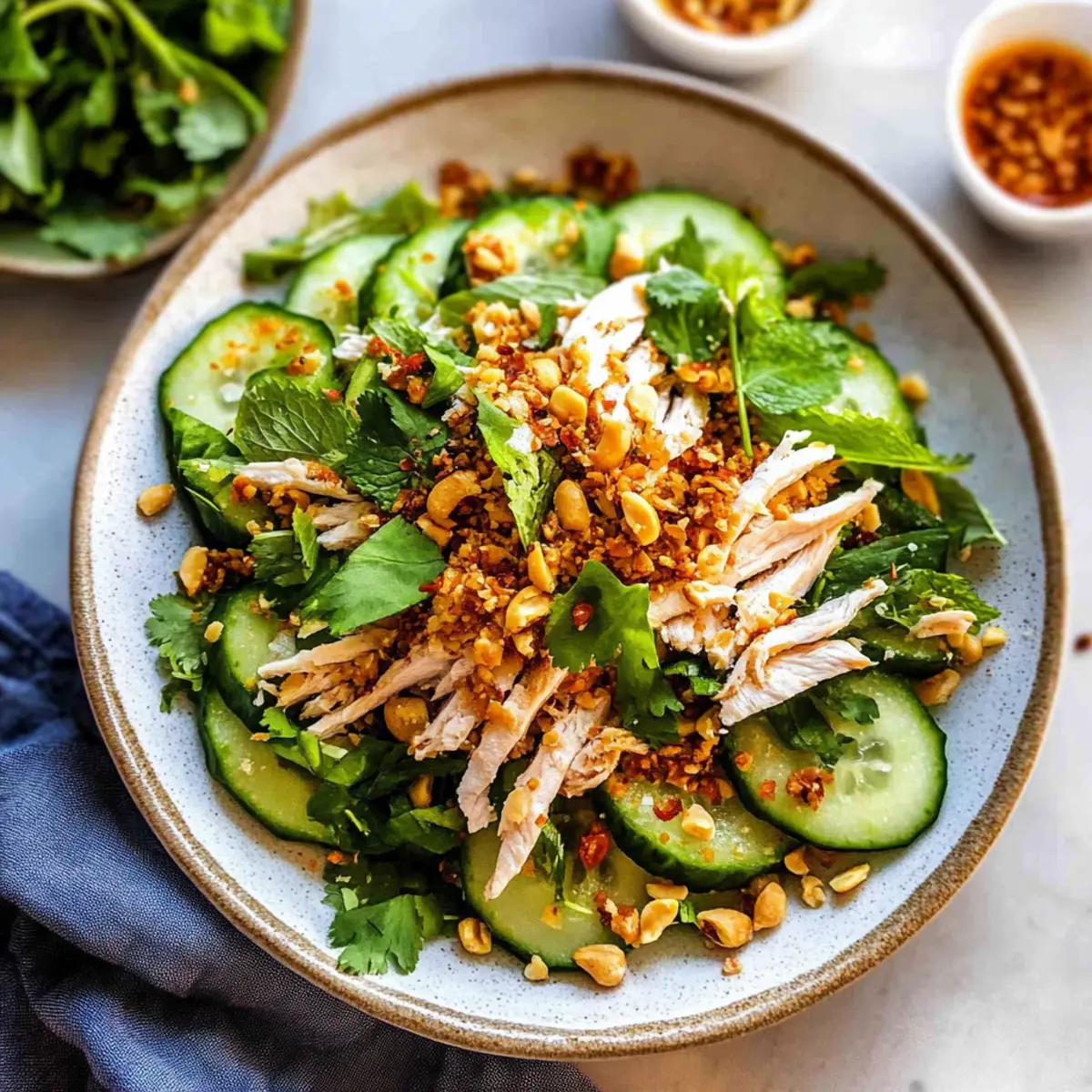 These Spicy Chicken Cucumber Salad components are perfect for meal prep enthusiasts! You can poach the chicken up to 24 hours in advance, allowing the flavors to deepen. Once cooled, store the shredded chicken in an airtight container in the refrigerator. Additionally, the dressing can be made up to 3 days ahead of time and kept chilled to maintain its vibrant flavor. Just remember to keep the salad ingredients—like cucumbers and fresh herbs—separate until you’re ready to serve to prevent wilting and sogginess. When it’s time to eat, simply assemble the salad by layering the cucumbers and chicken, and drizzle the freshly prepared dressing over the top for that delightful crunch and zing!