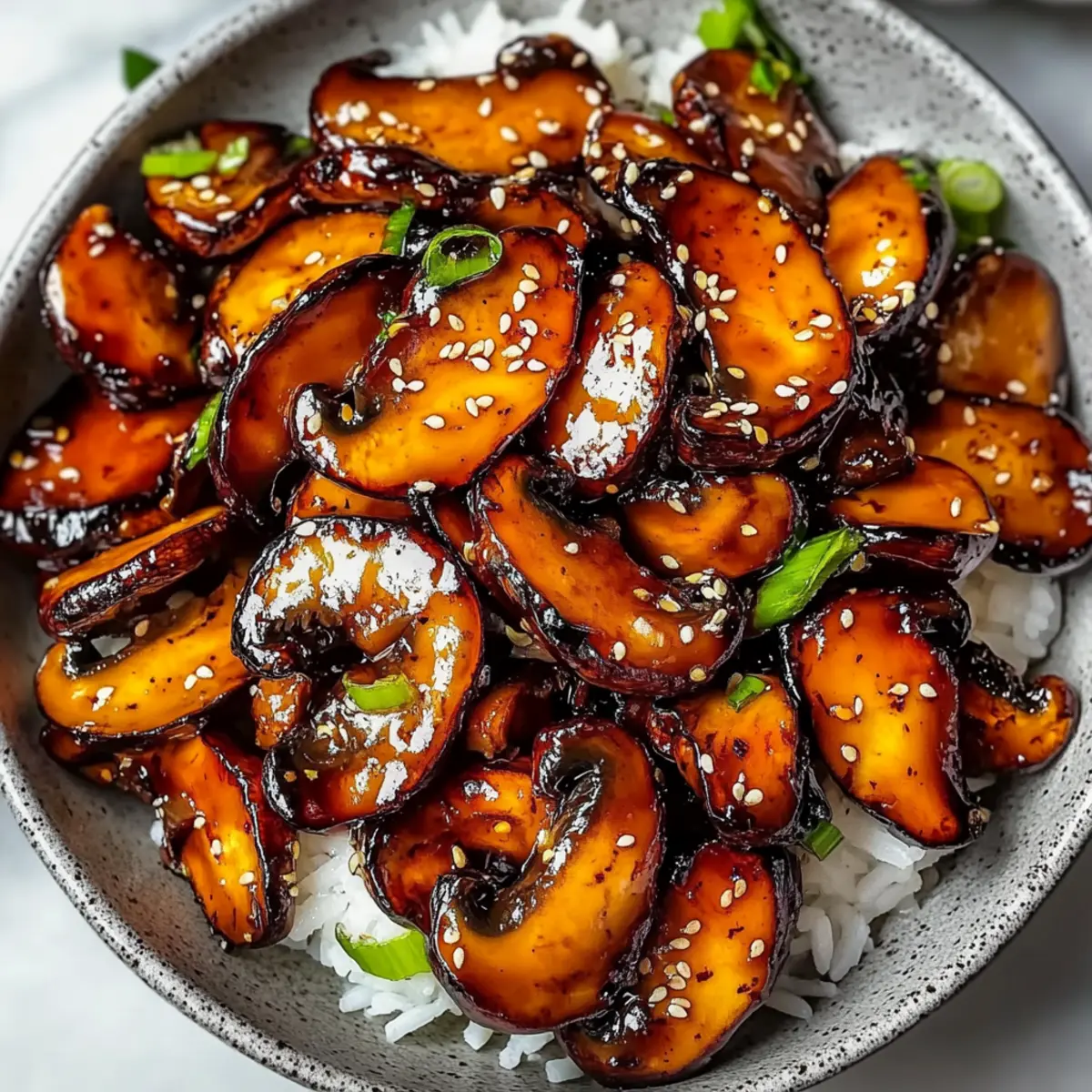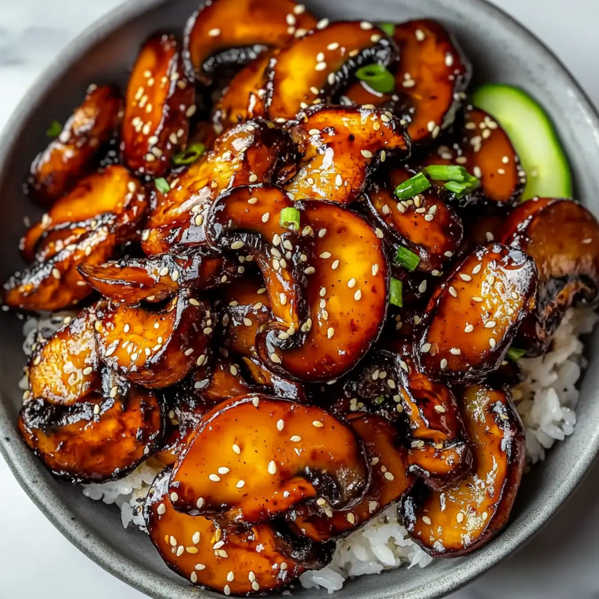- Transfer mushrooms to a serving platter, pairing with steamed rice and garnish with cucumber, sesame seeds, and scallions.