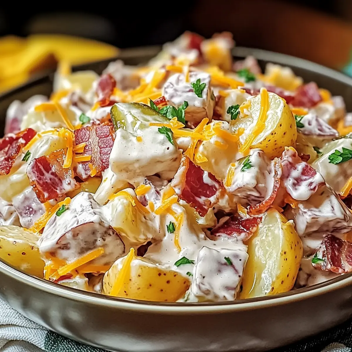 - In a large bowl, combine the diced potatoes, crumbled bacon, shredded cheddar cheese, and diced dill pickles. Fold in the dressing and herbs until fully coated.