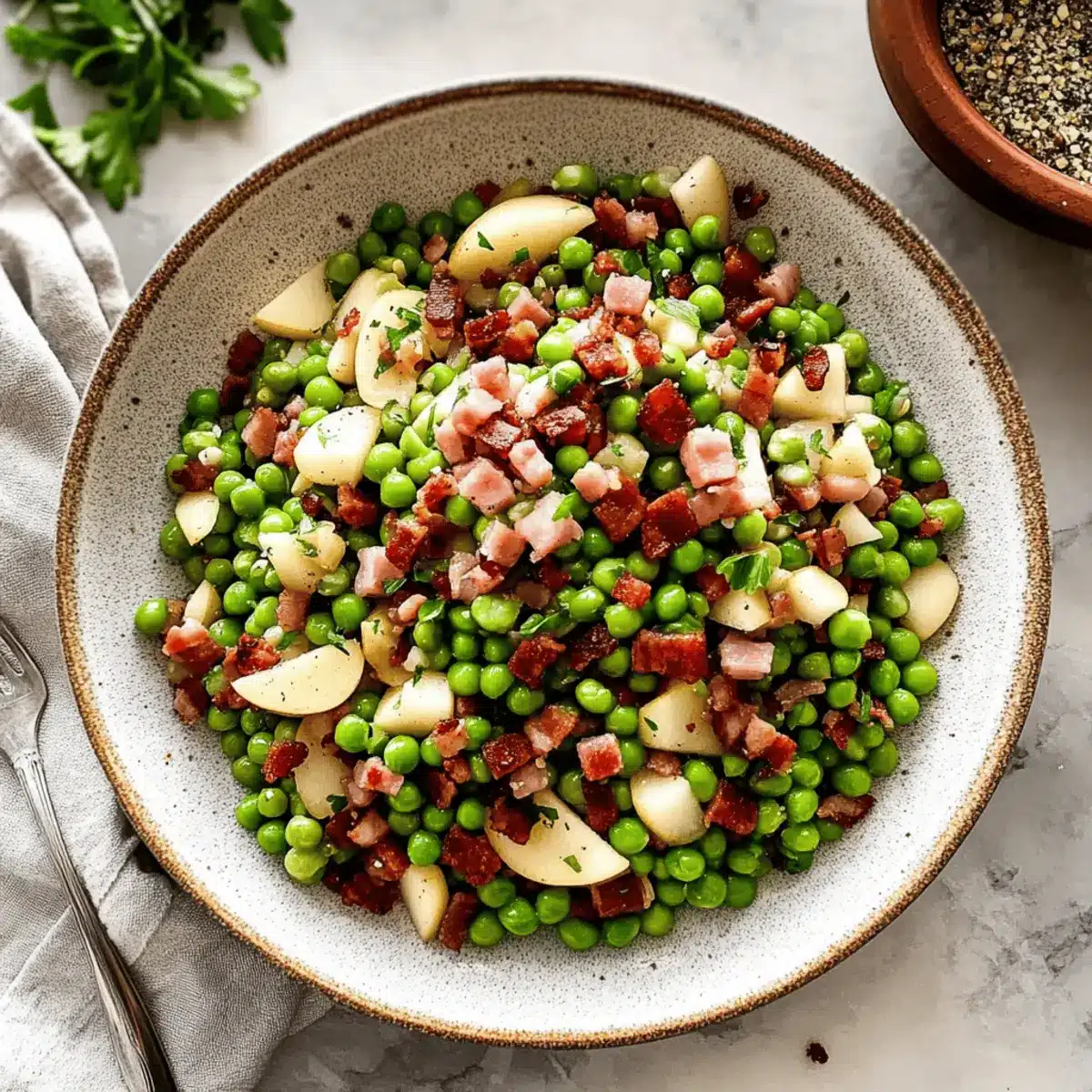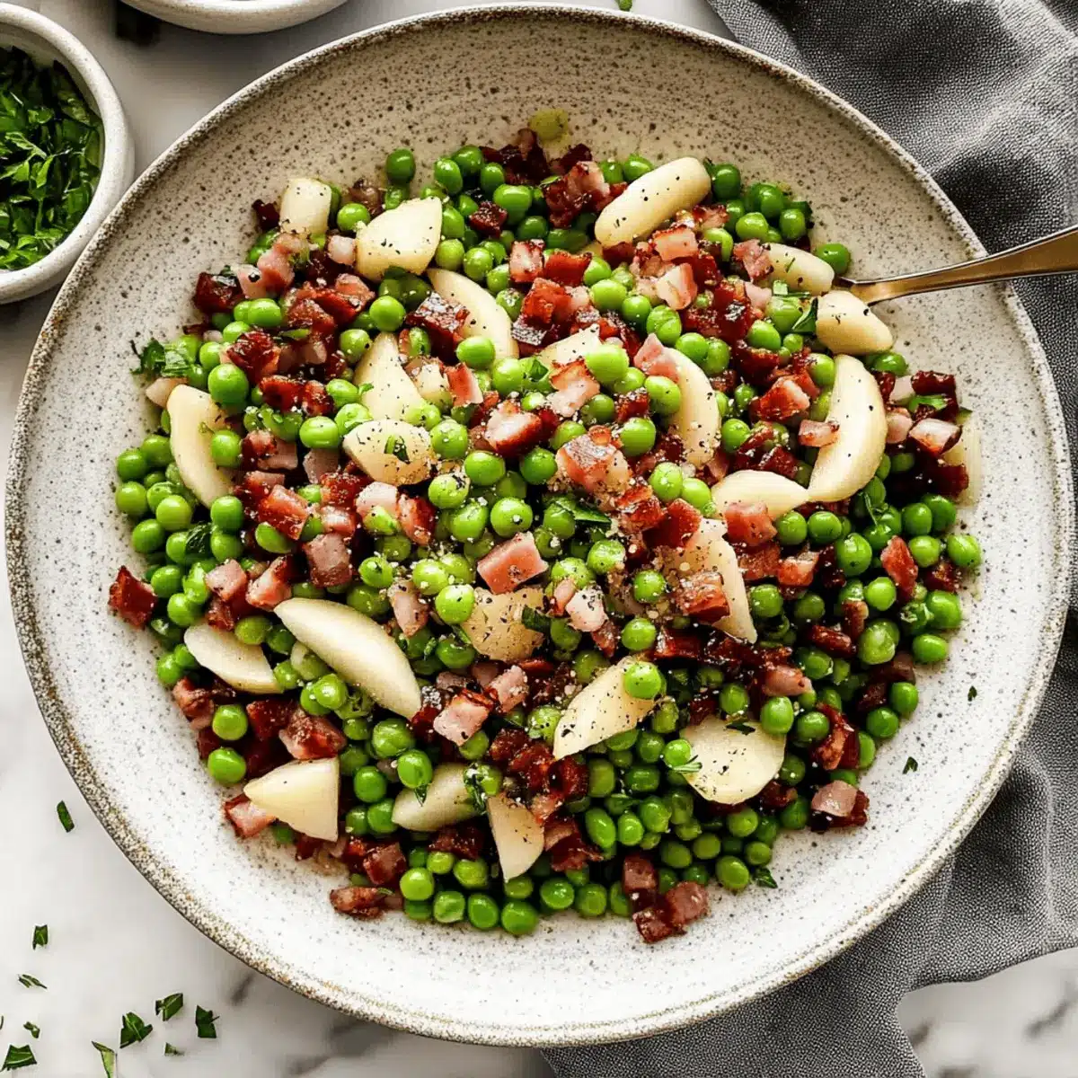 Impressive Presentation: Vibrant green peas and golden pancetta make for a visually stunning dish that will have everyone reaching for seconds.