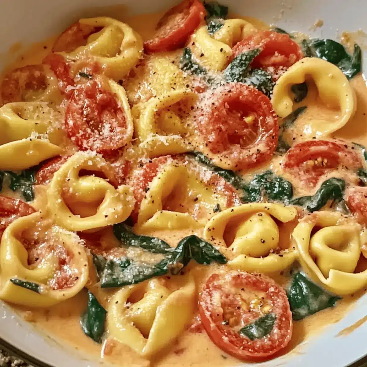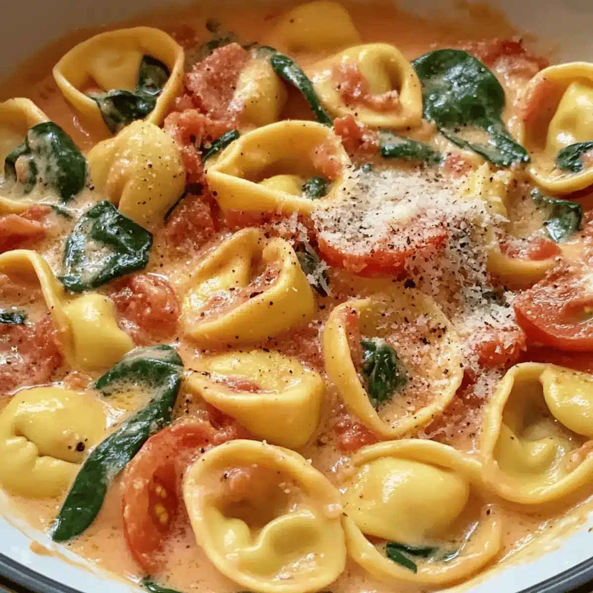 Fold in 3 cups of cooked cheese tortellini along with 2 cups of chopped spinach into the creamy tomato sauce. Stir gently until the spinach wilts and the tortellini is evenly coated with the rich sauce, making this meal come together perfectly.
