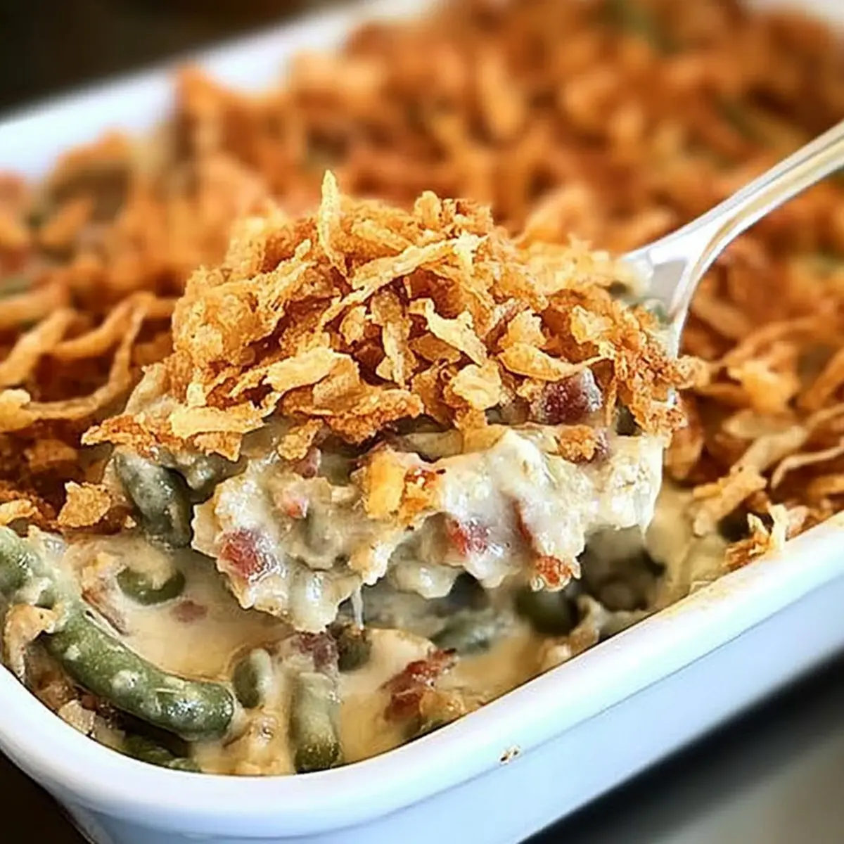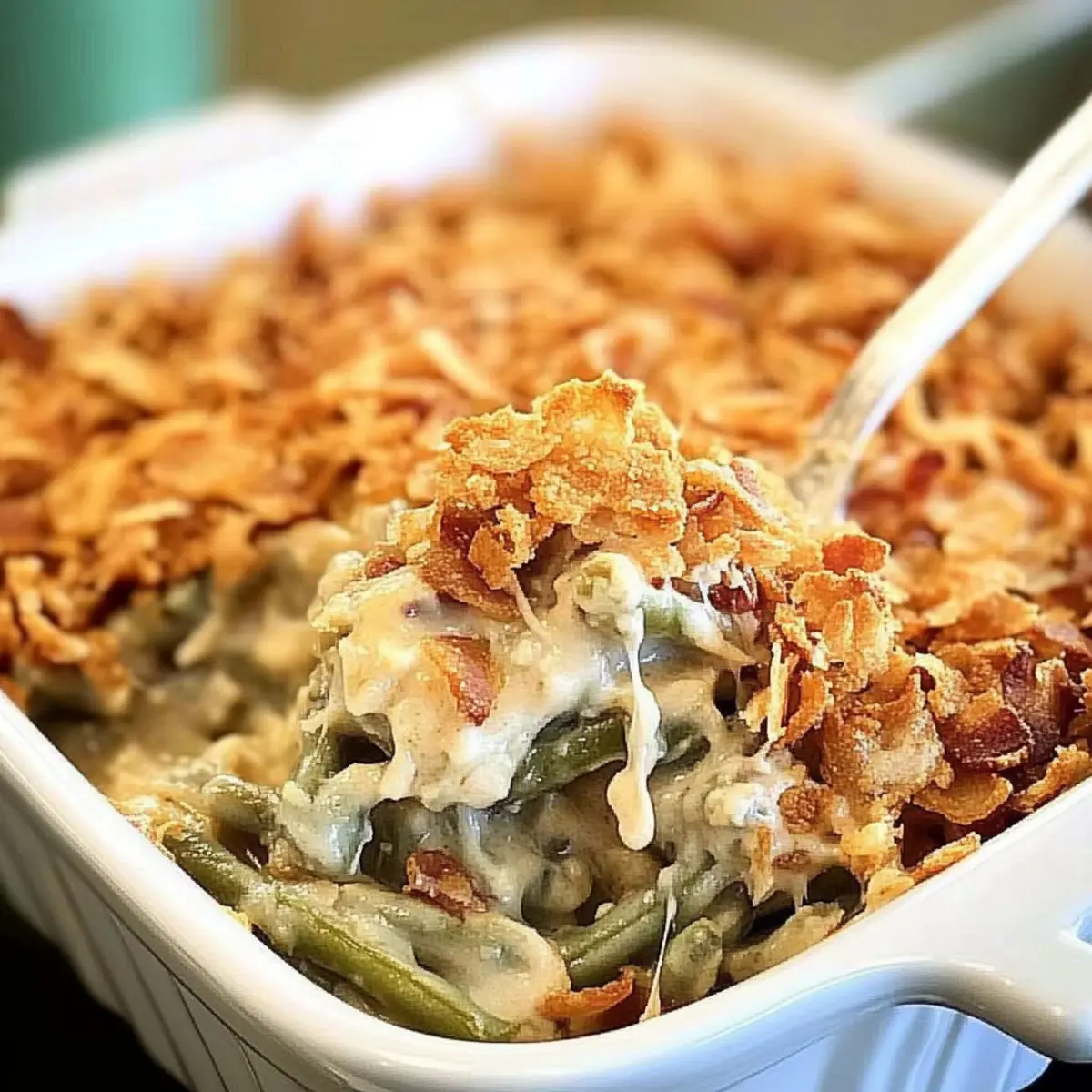 Comforting and Familiar: This Ultimate Green Bean Casserole blends nostalgic flavors with savory bacon and melted cheese, enhancing your holiday spread.