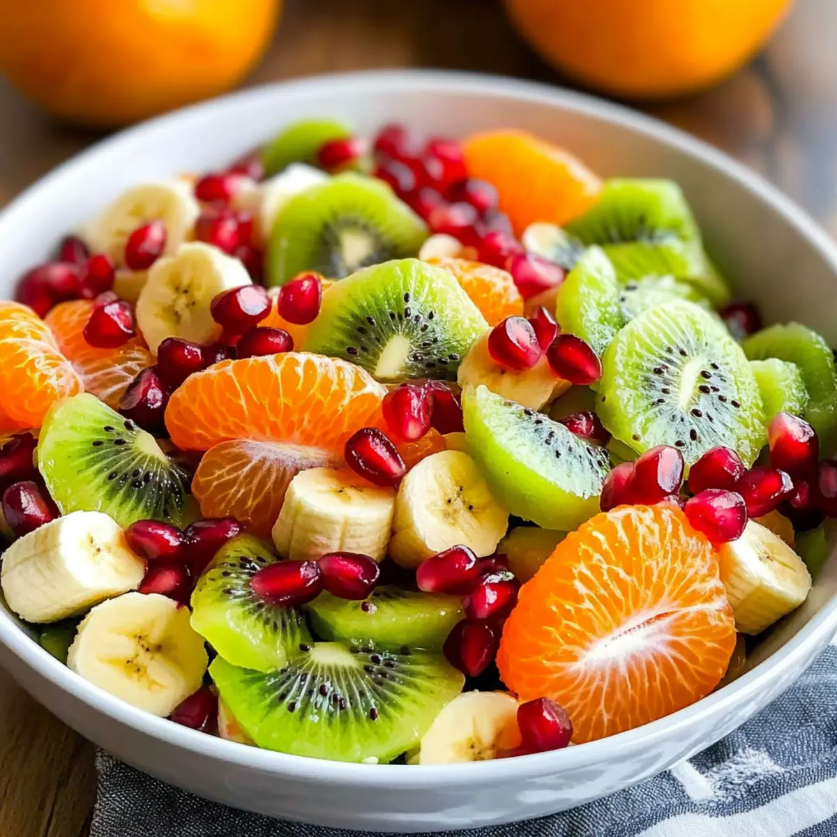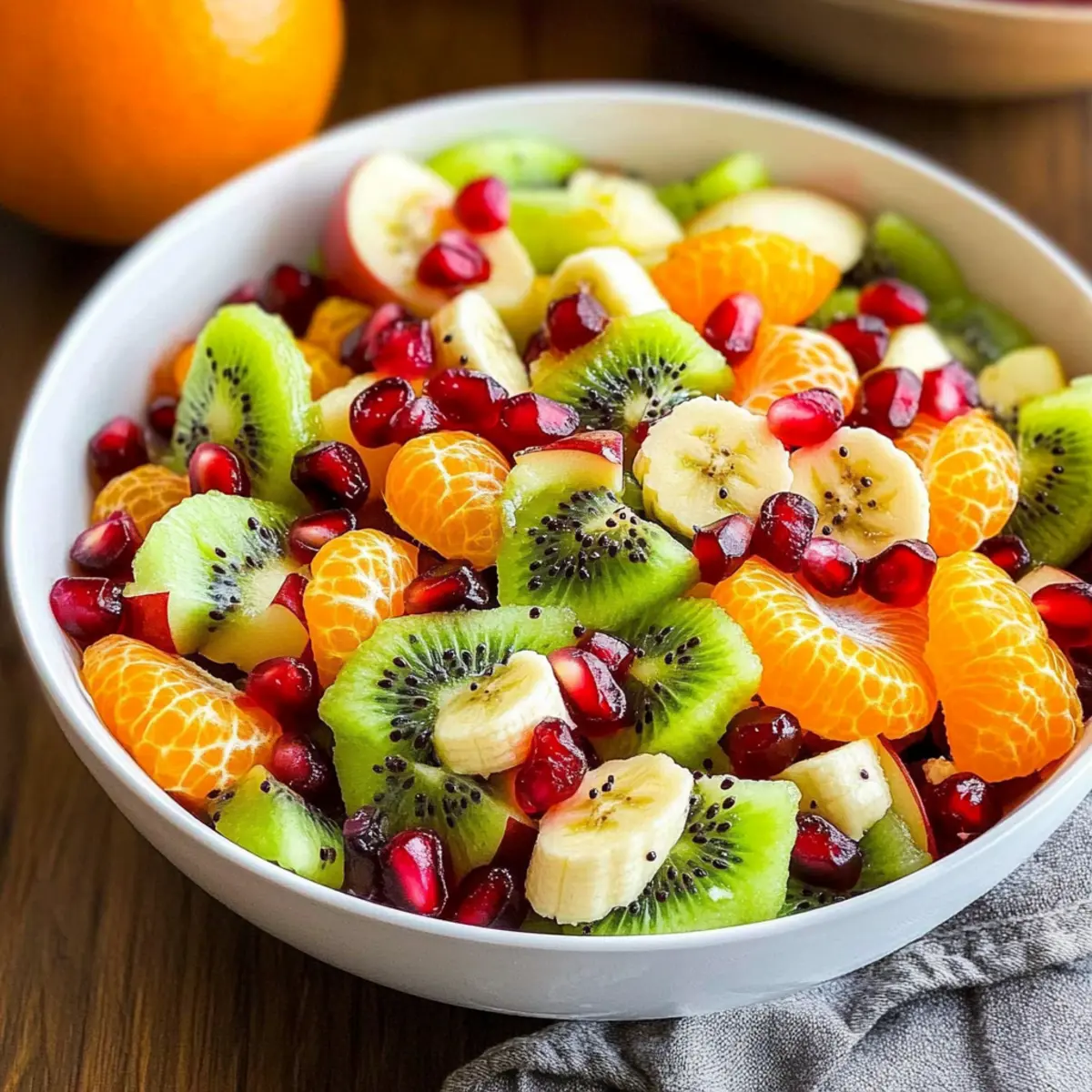 - In a large salad bowl, combine the mandarin segments, diced apples, kiwi slices, banana pieces, and pomegranate arils. Gently fold all ingredients together.