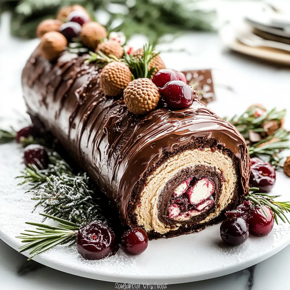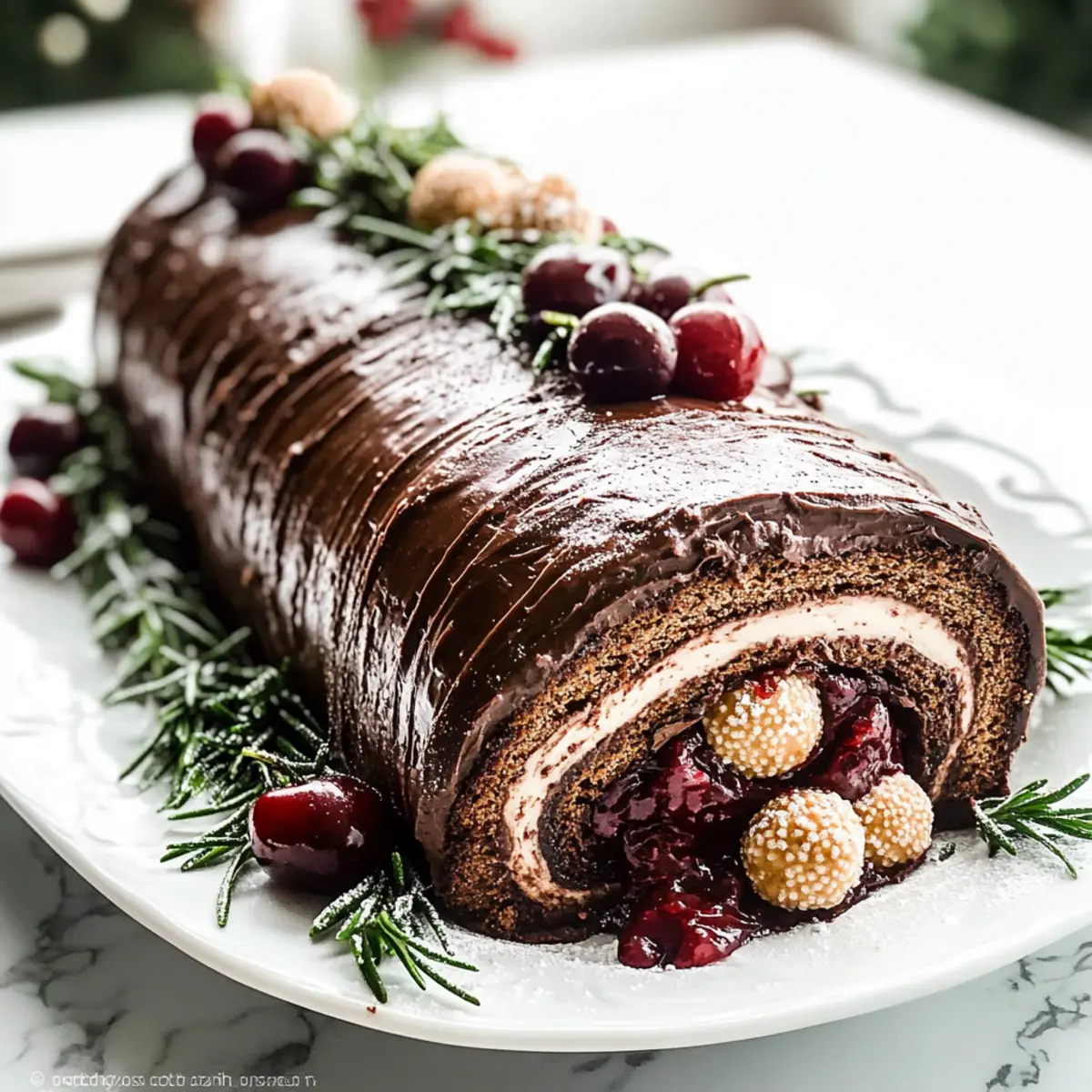 Gently unroll the cooled sponge and spread an even layer of the whipped cream over the surface, followed by half of the cherry pie filling. Starting from one end, roll the sponge back into a log shape, taking care to keep it tight. Transfer the rolled Yule Log onto a serving platter, pouring the ganache over the top while allowing it to drip down the sides for a beautiful finish. Decorate with fresh cherries and rosemary for a festive touch.