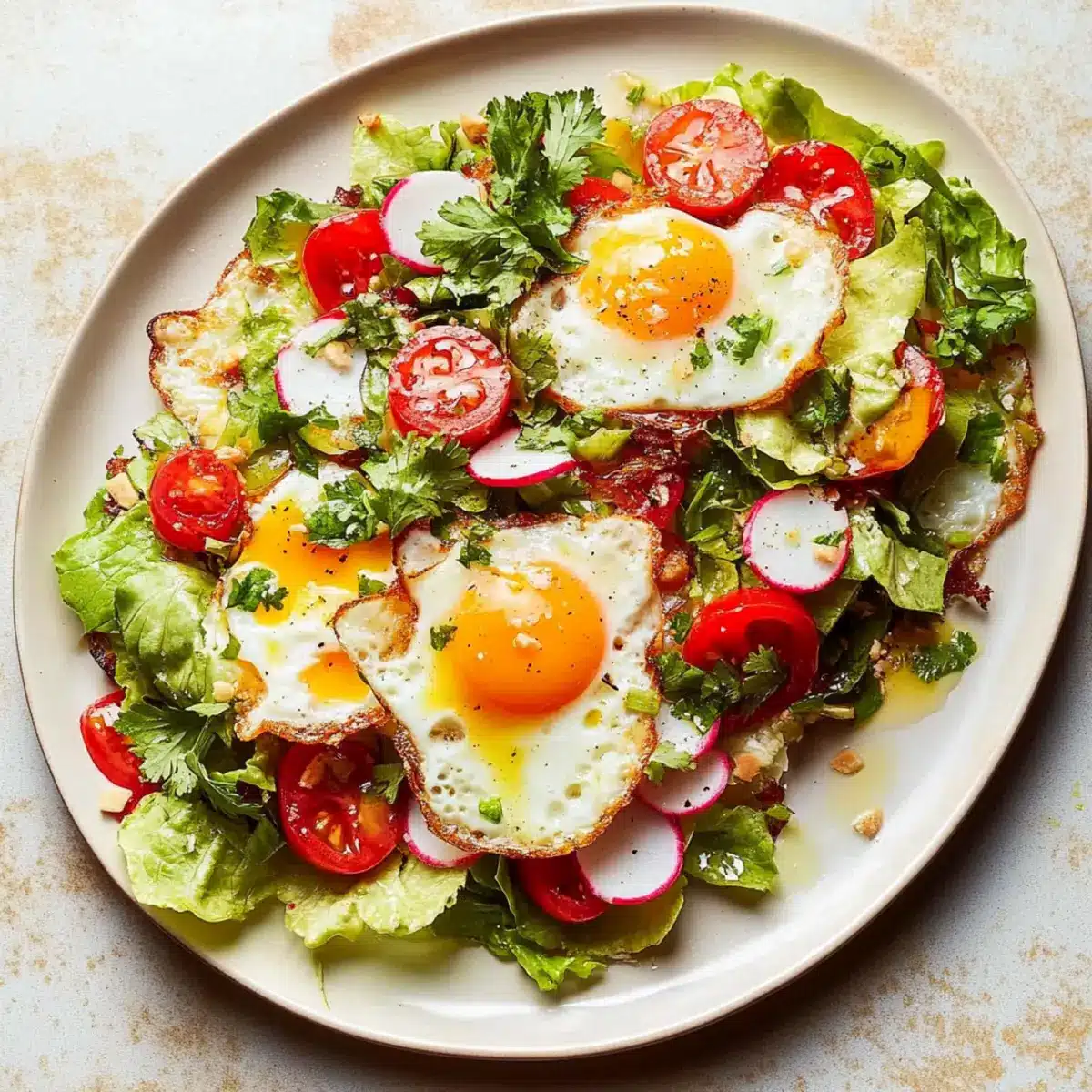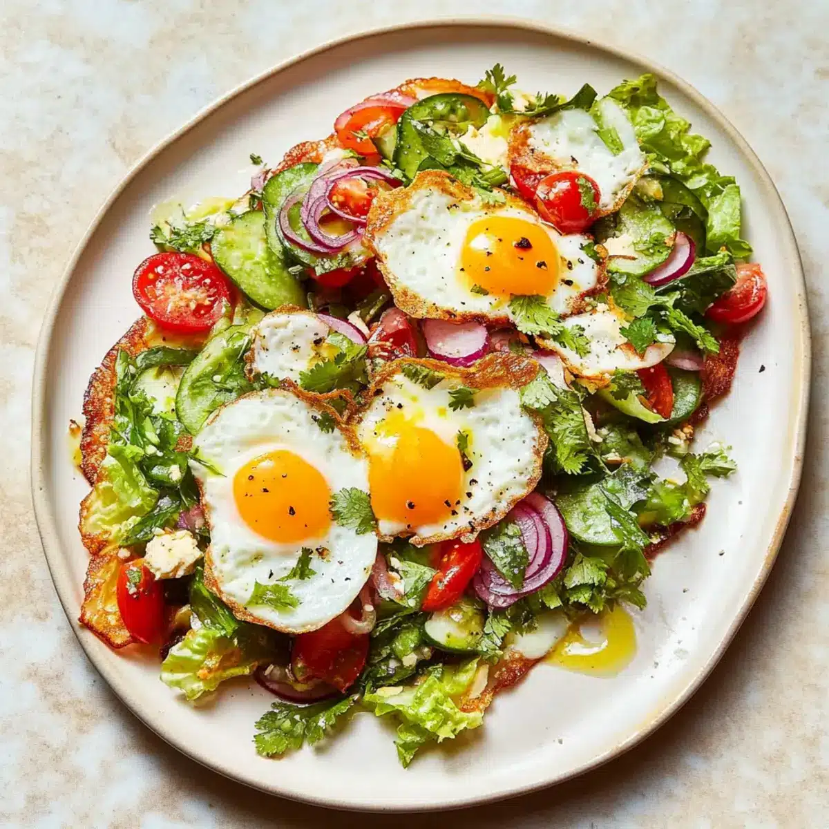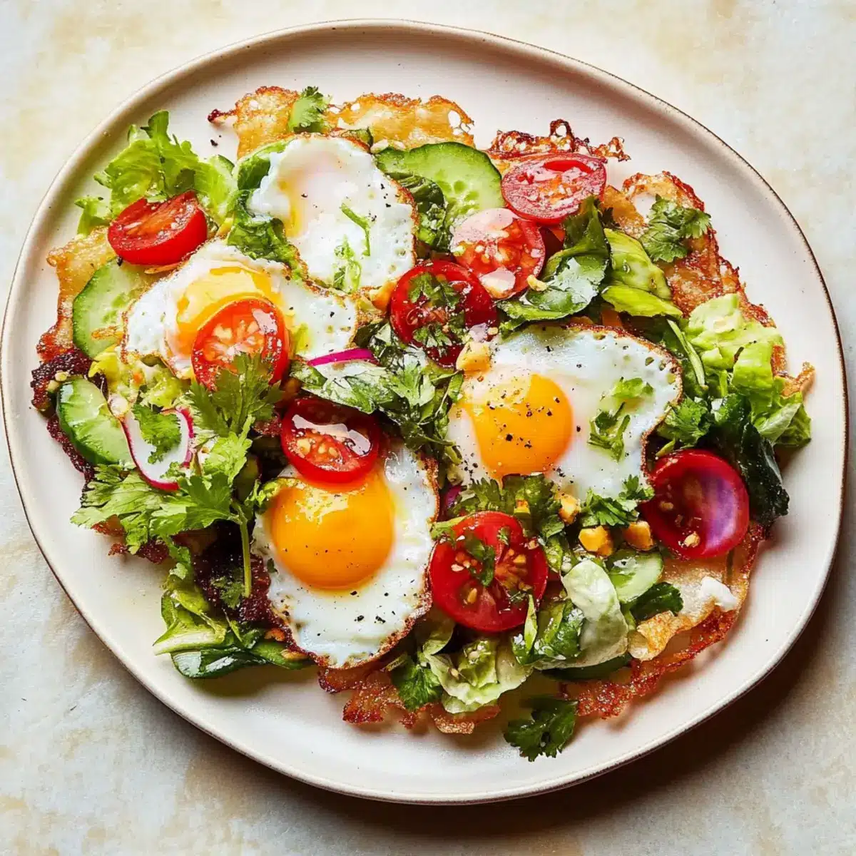 Crispy Perfection: The golden-brown fried eggs create an irresistible crunch that contrasts beautifully with fresh veggies.